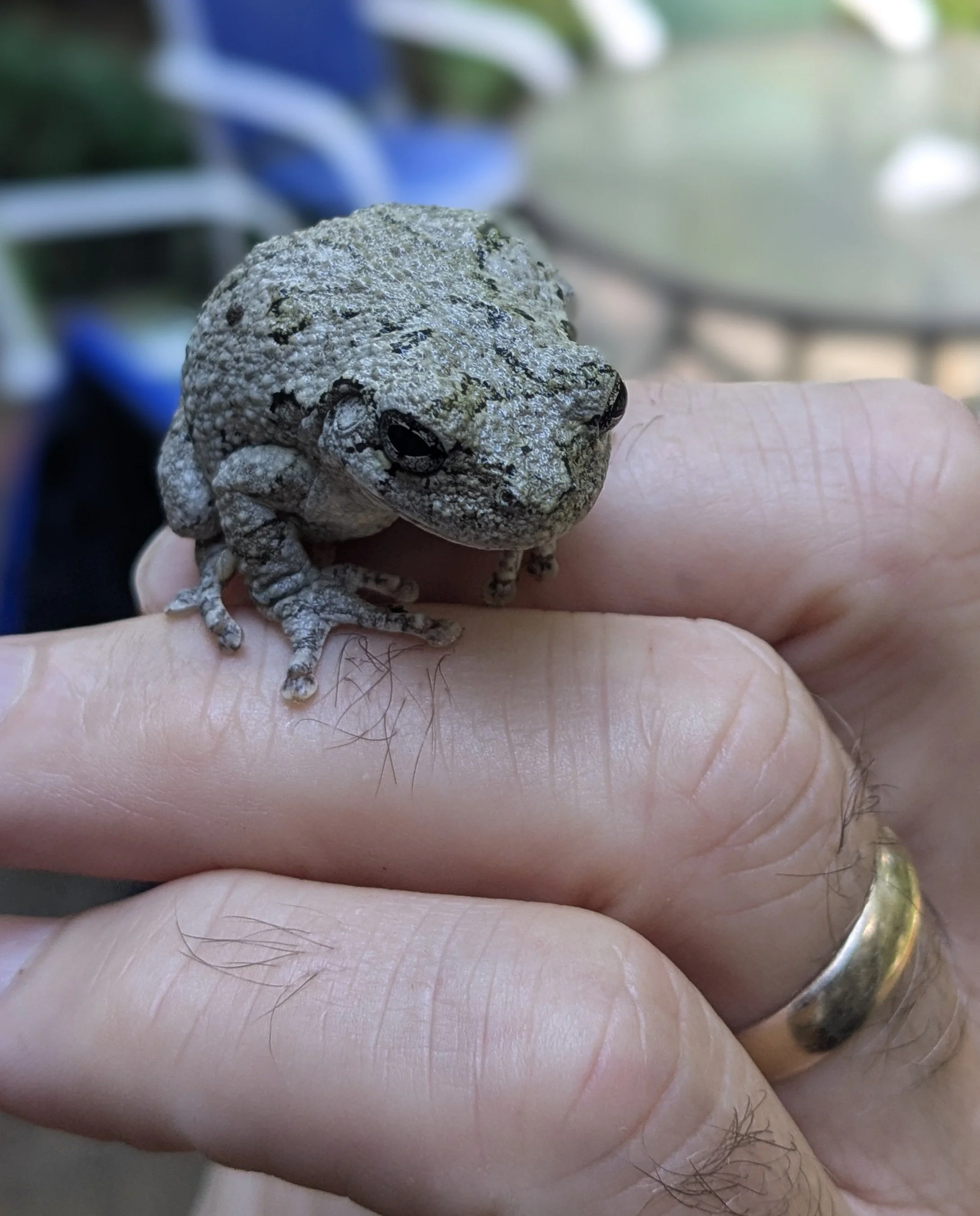 Their shouts of discovery drew Tim, who came back up to the porch to show us the tiny Cope's gray treefrog Dryophytes chrysoscelis. I thought I saw Jesus winking as we all admired the tiny frog that the two professional naturalists who happened to be on hand said they rarely saw because of its clever camouflage. To honor such a special ‘coincidence’, here’s your third picture.
